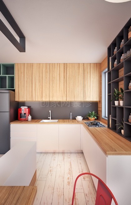 厨房银行和电视机共用一面墙。粗壮的木屐干脆拔了出来,高蹲的时候,餐台就会变成酒吧。