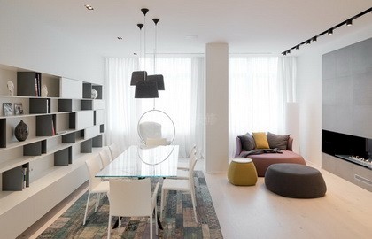 客厅的一侧有一个简单的饭厅,墙上设计有斯堪的纳维亚风格的气息。各种规格的吊灯和白色家具与诠释艺术生活气氛的古典艺术氛围相协调。