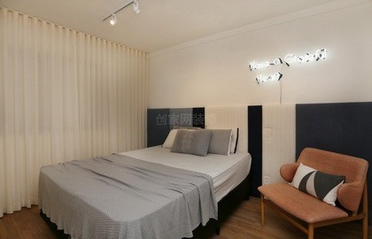 床边定制了推拉门衣帽间,不占空间。比平开门更方便开启和关闭。有内置灯,找衣服时一眼就能看出来。灰色的柜子与整体风格很相配。在映射下,整个房间看起来很有气质。